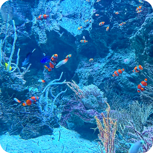 鮮やかな模様をまとったカクレクマノミやチンアナゴ、ダイナミックに泳ぐサメやエイなど、驚きと感動の連続。まるで世界中を旅しているような気分で、地球の多様な”海の顔”を体感してみてください。